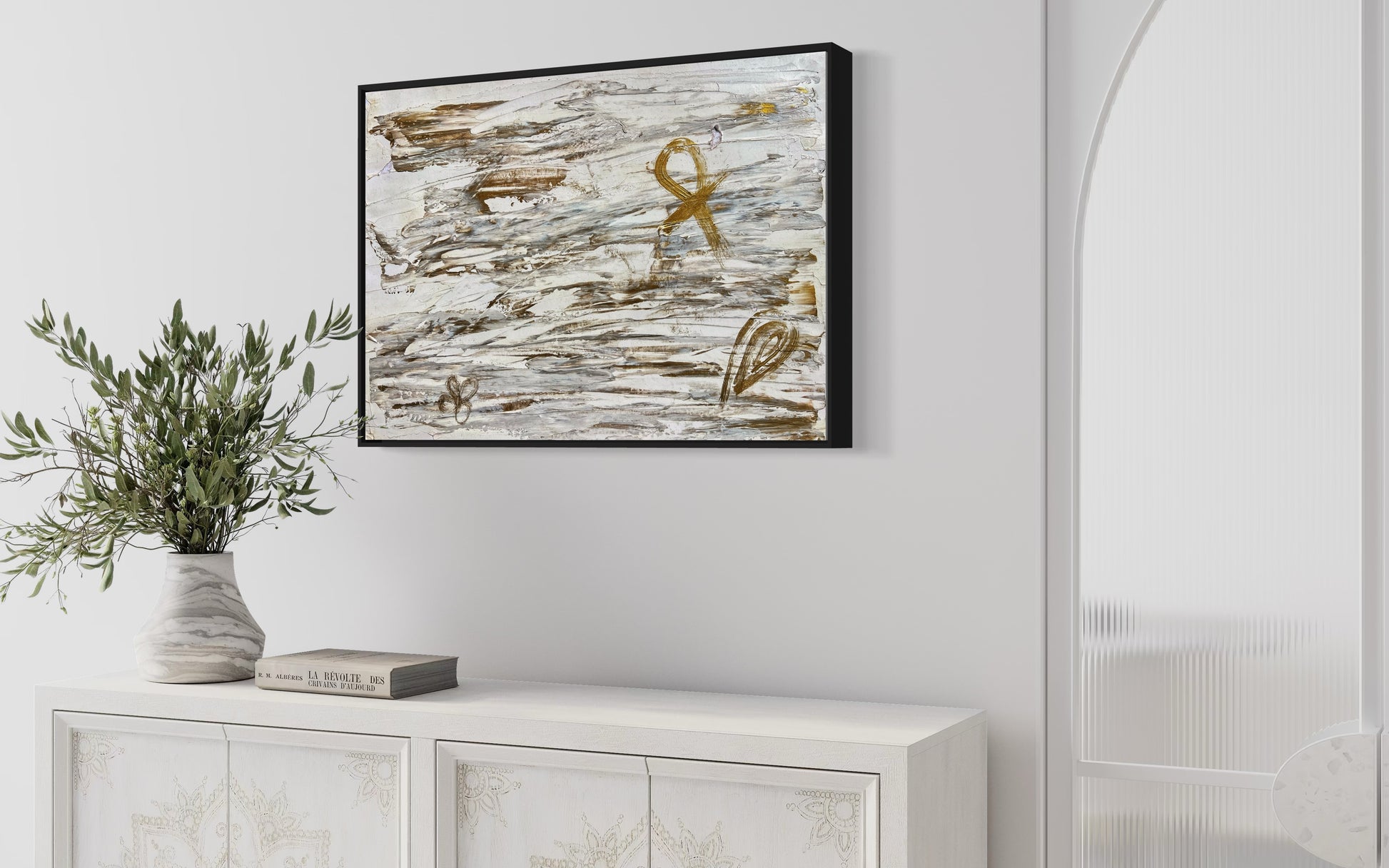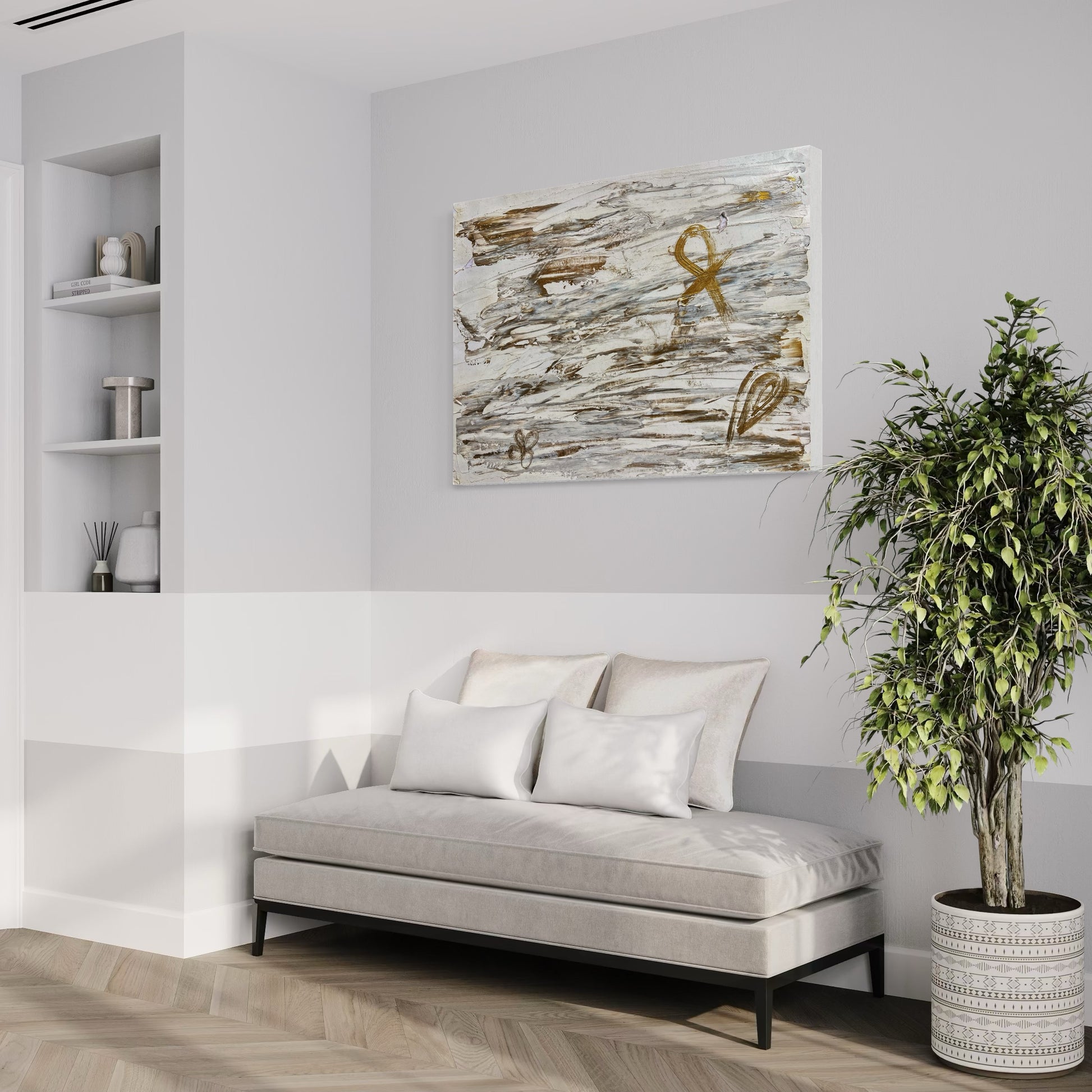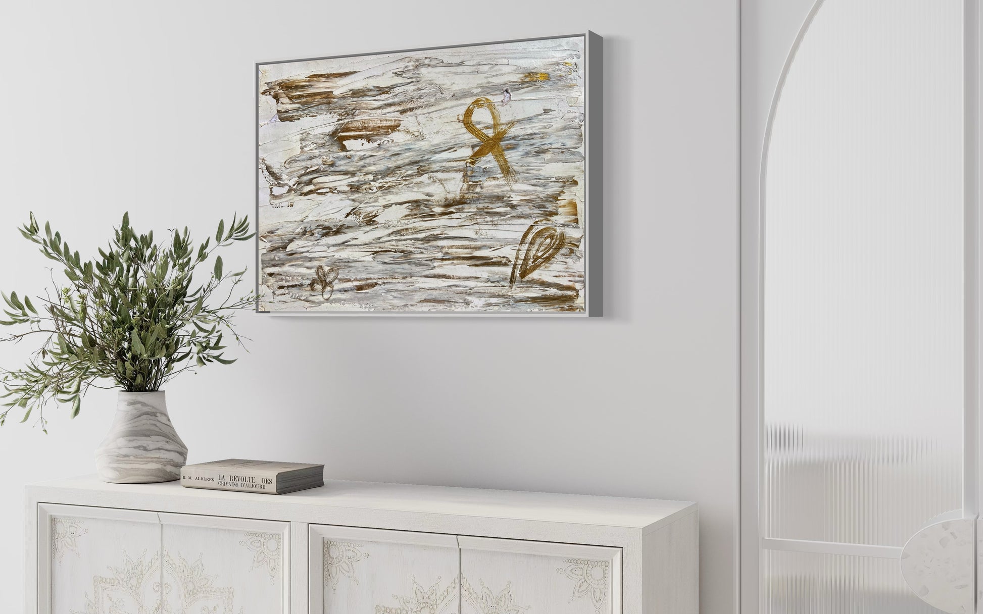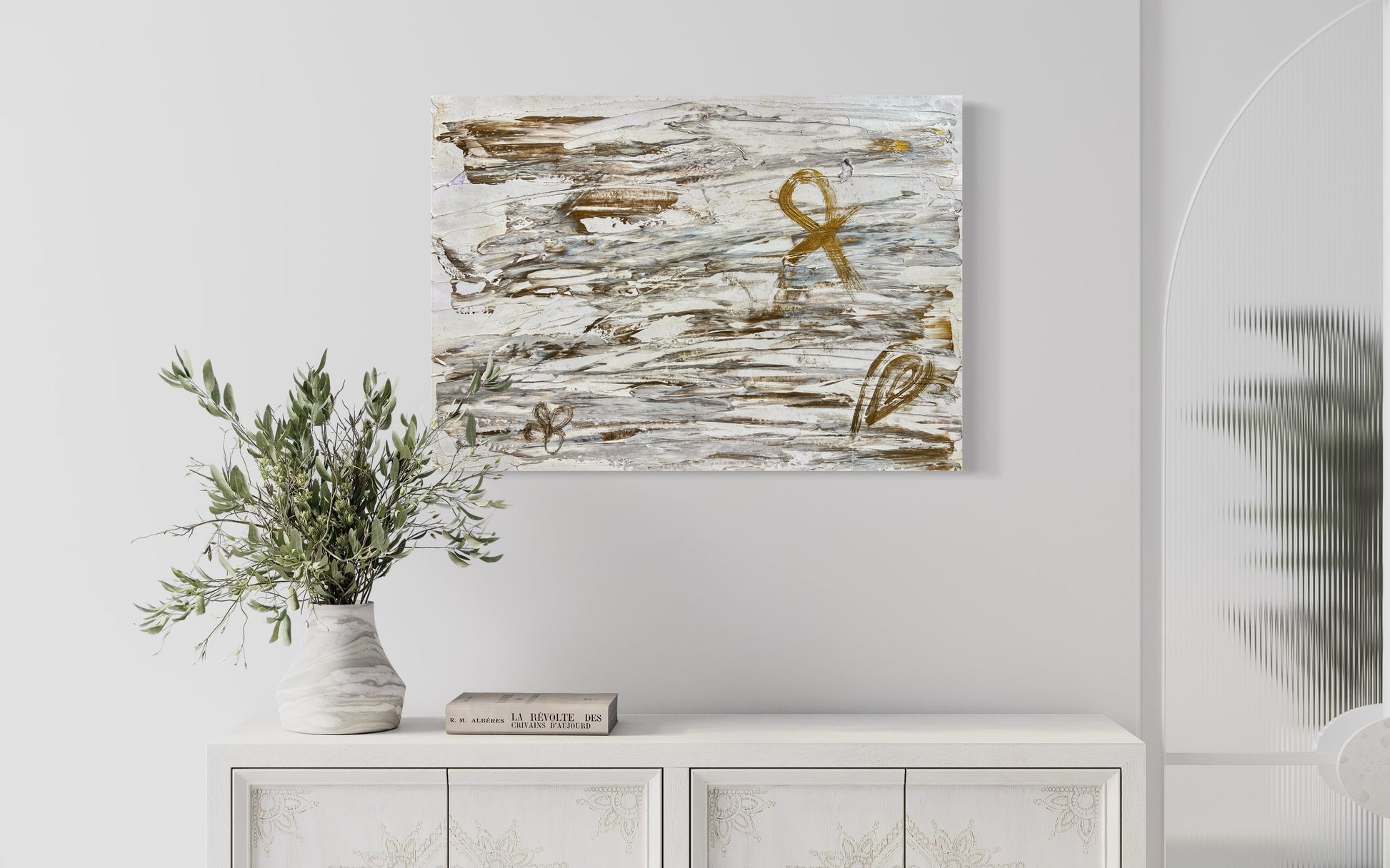 “Alive” is a profound abstract piece that weaves together ancient symbolism and modern expression. Rendered in a calming palette of white and metallic bronze, this artwork evokes a sense of sacred balance and spiritual continuity.