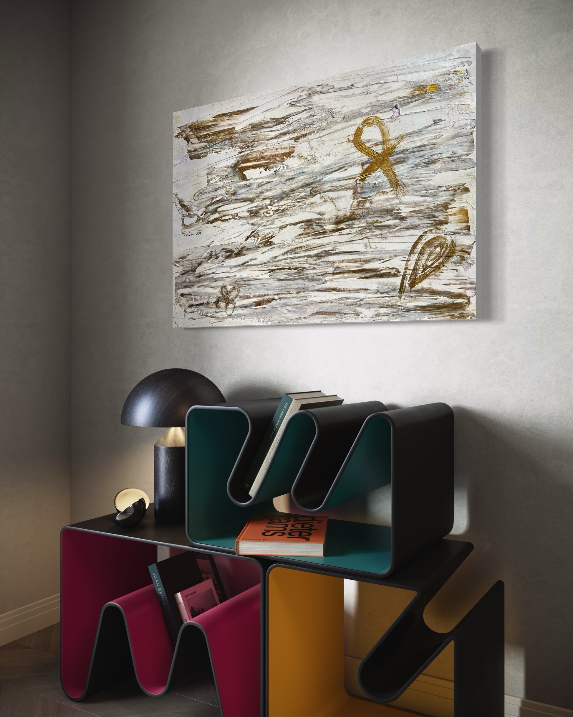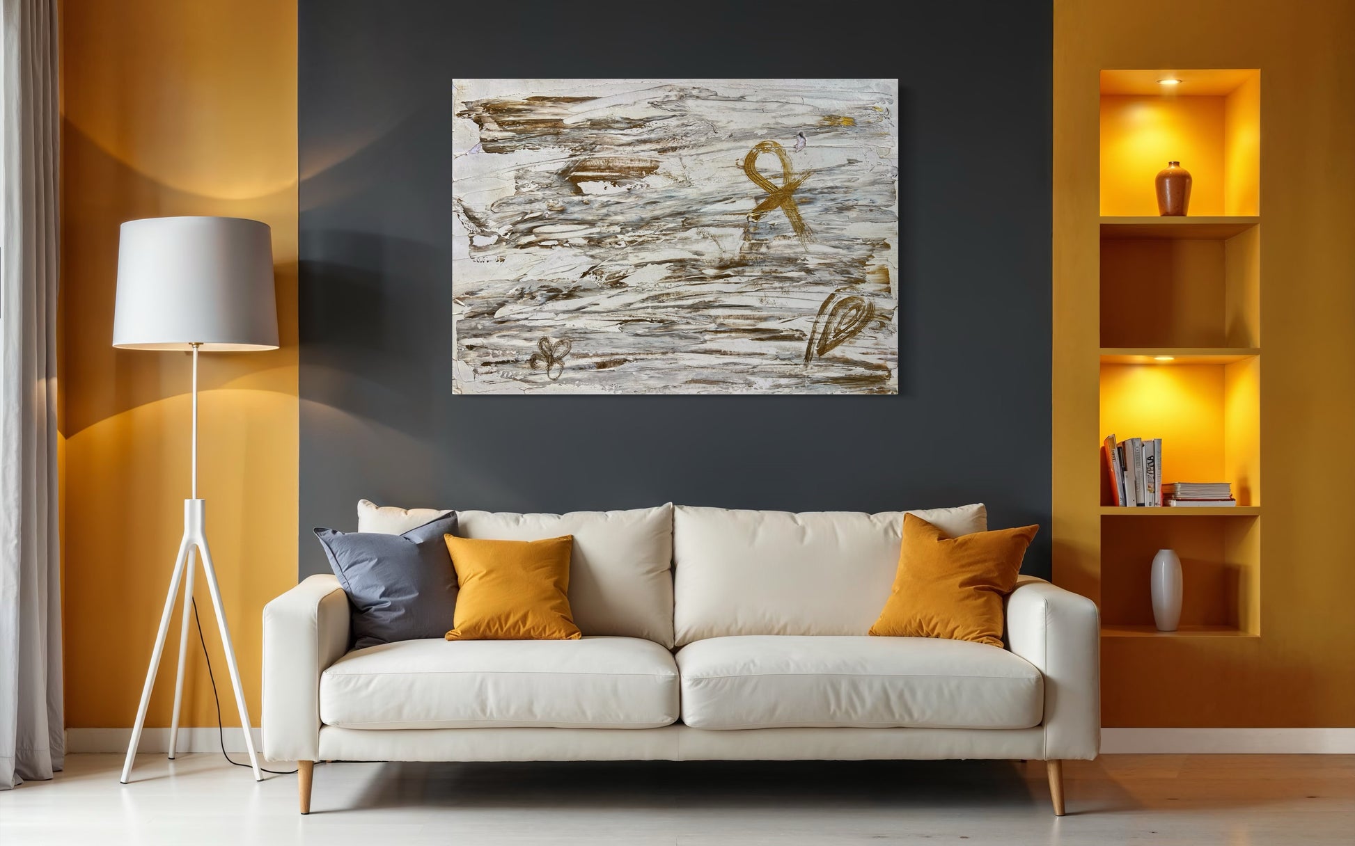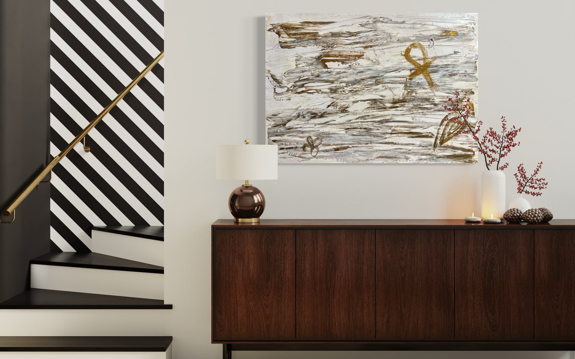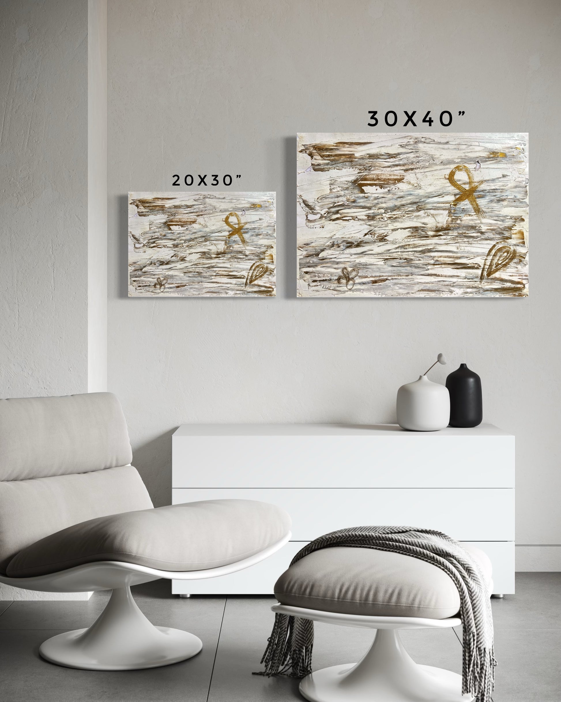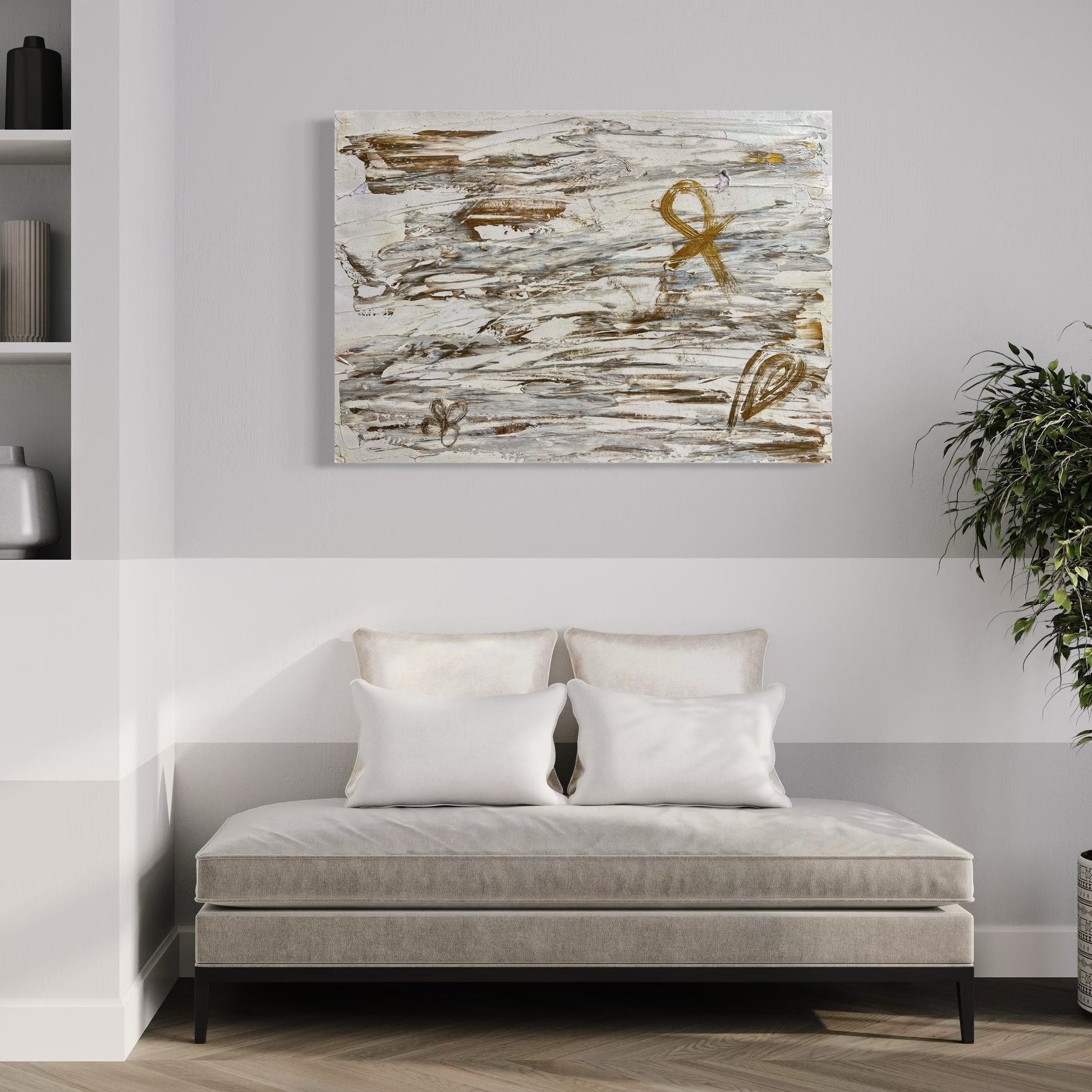 “Alive” is a profound abstract piece that weaves together ancient symbolism and modern expression. Rendered in a calming palette of white and metallic bronze, this artwork evokes a sense of sacred balance and spiritual continuity.