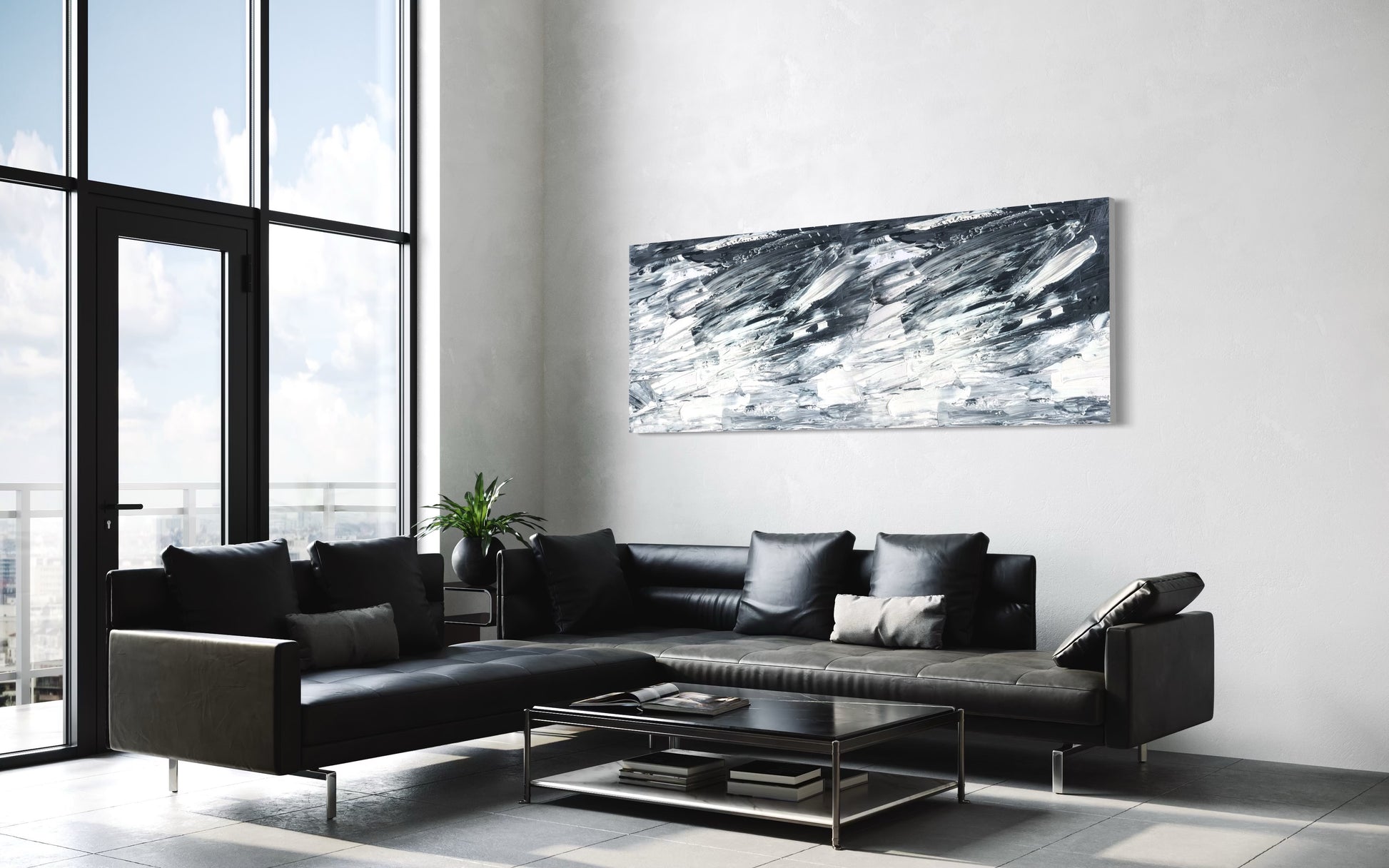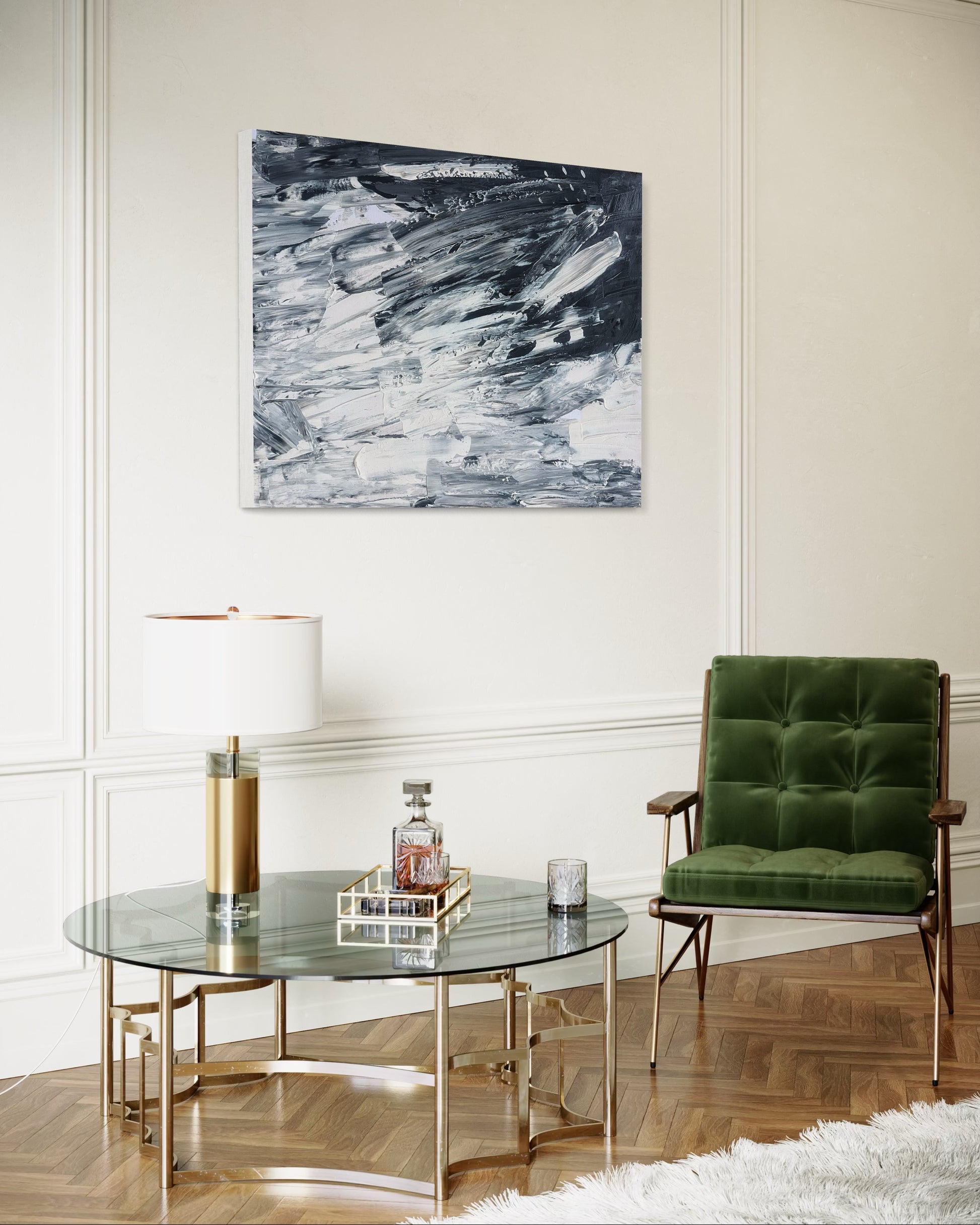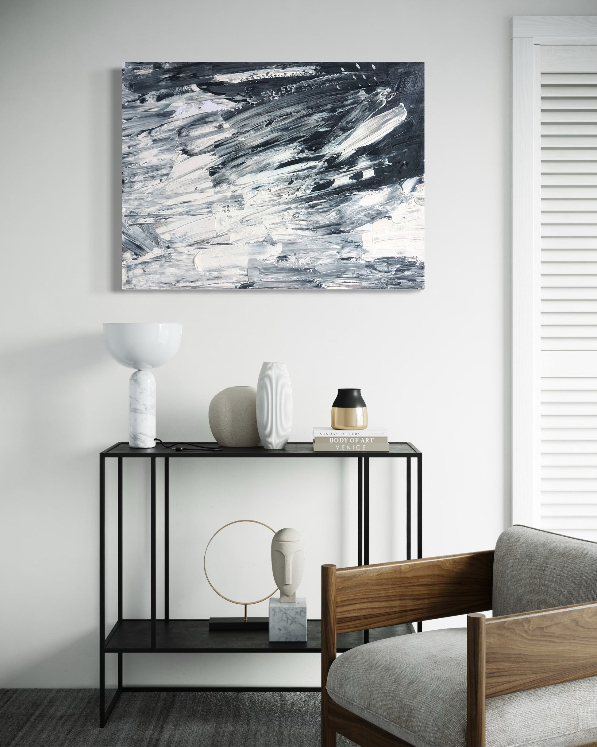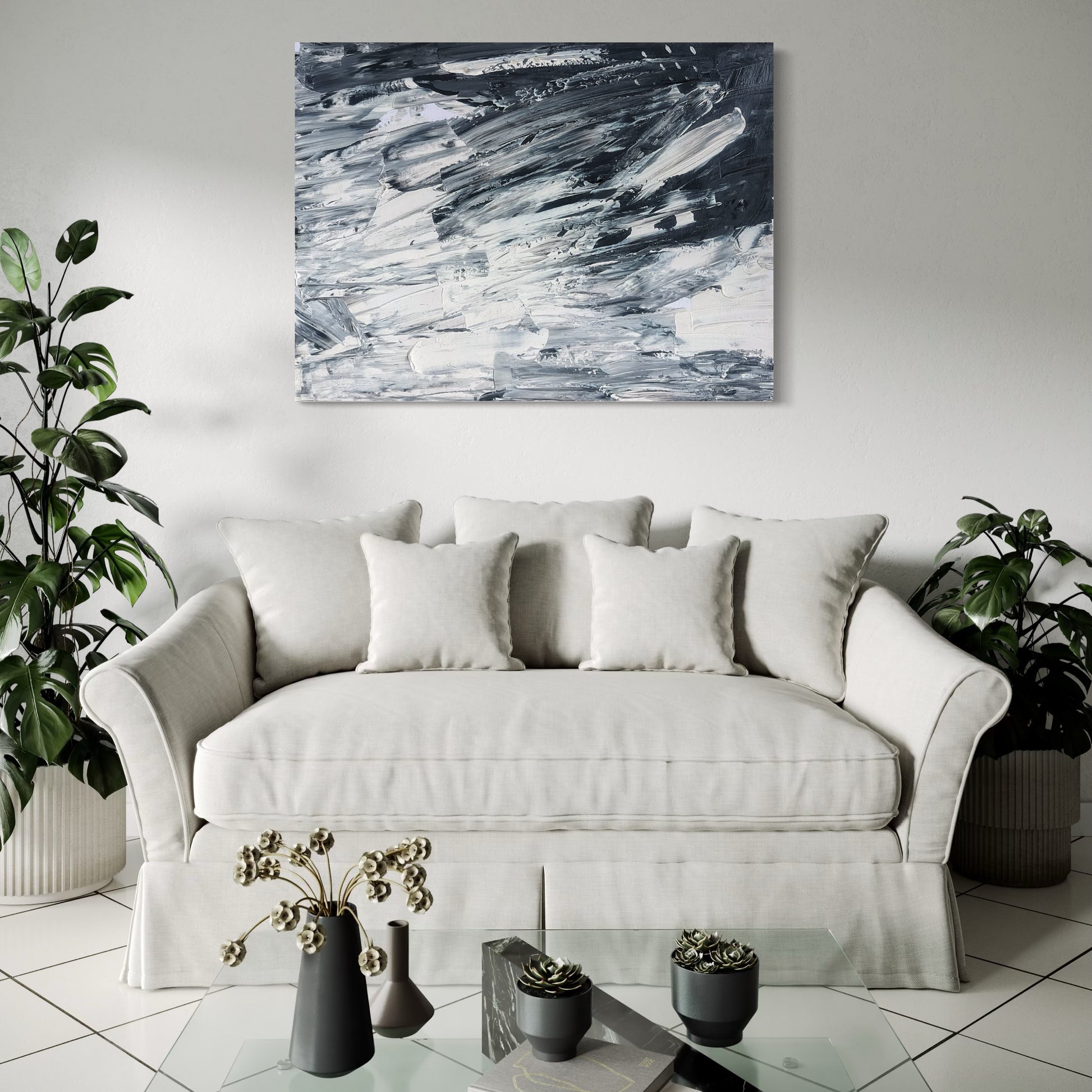 Drift captures the quiet turbulence of thoughts and emotions — a visual meditation on movement, uncertainty and inner stillness. With sweeping strokes of black, white, and silvery grey, this textured abstract work evokes the sensation of drifting clouds, shifting tides or fleeting memories. The monochrome palette allows the bold palette knife textures to take center stage, creating an atmosphere that is both intense and calming.