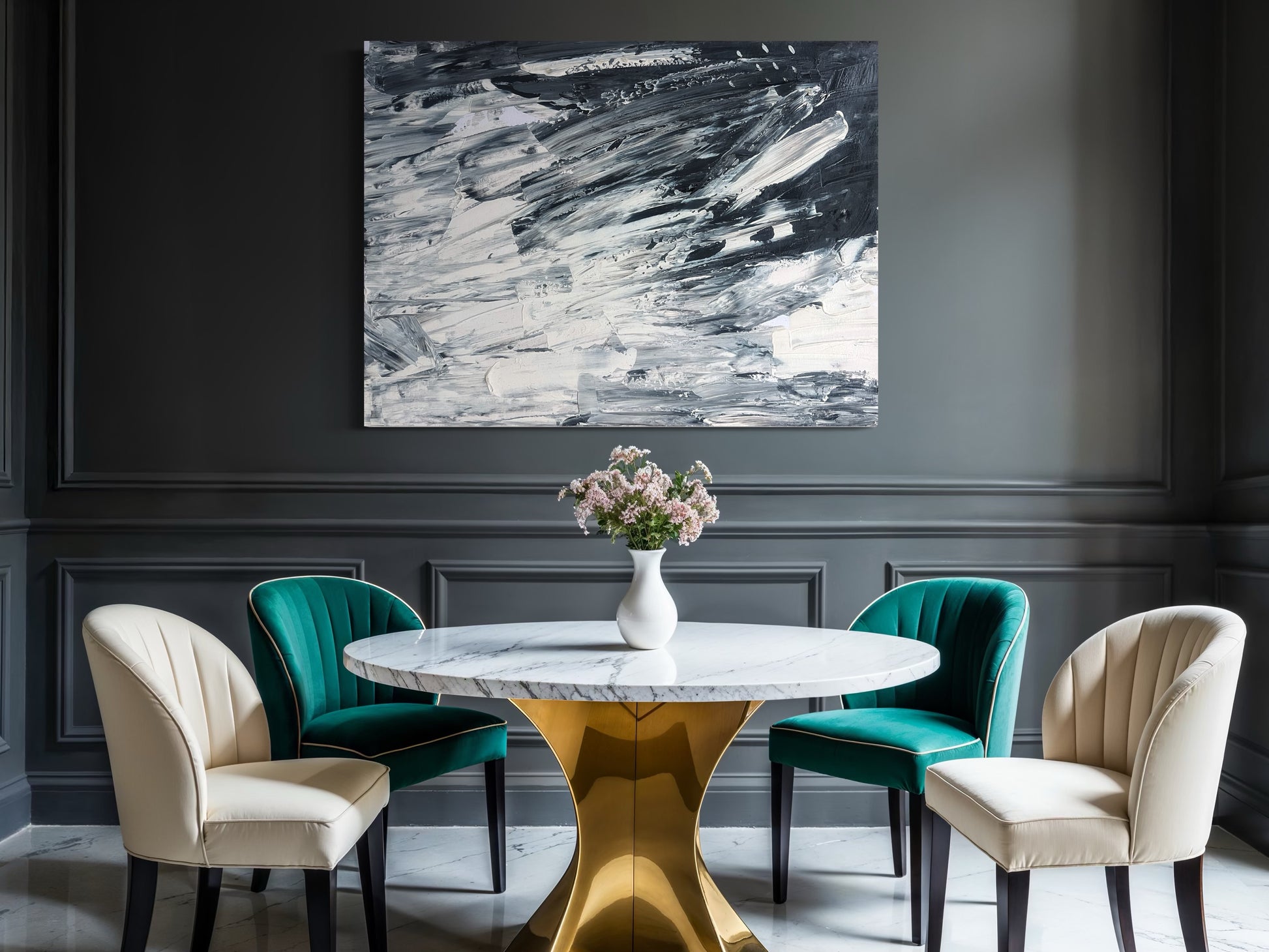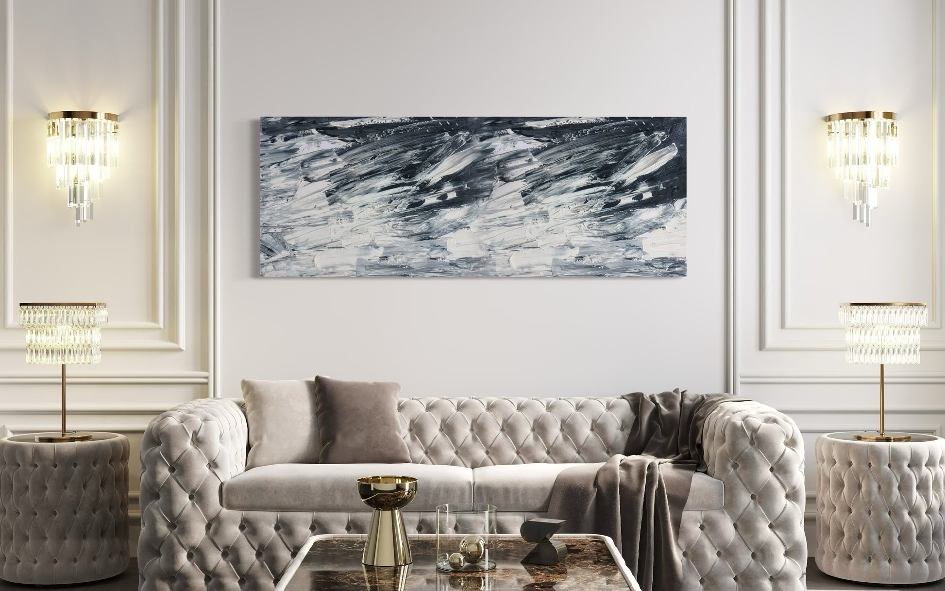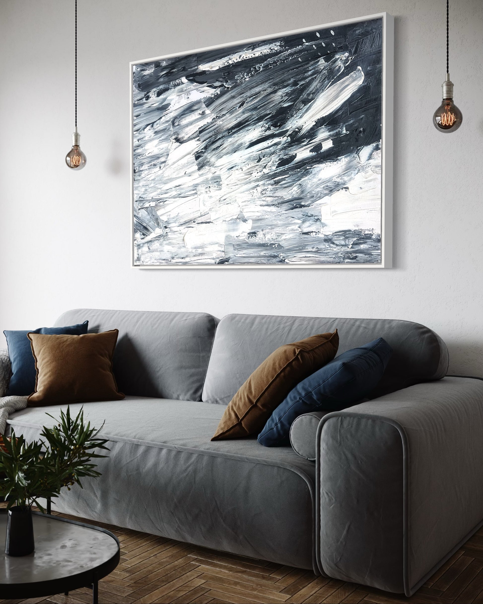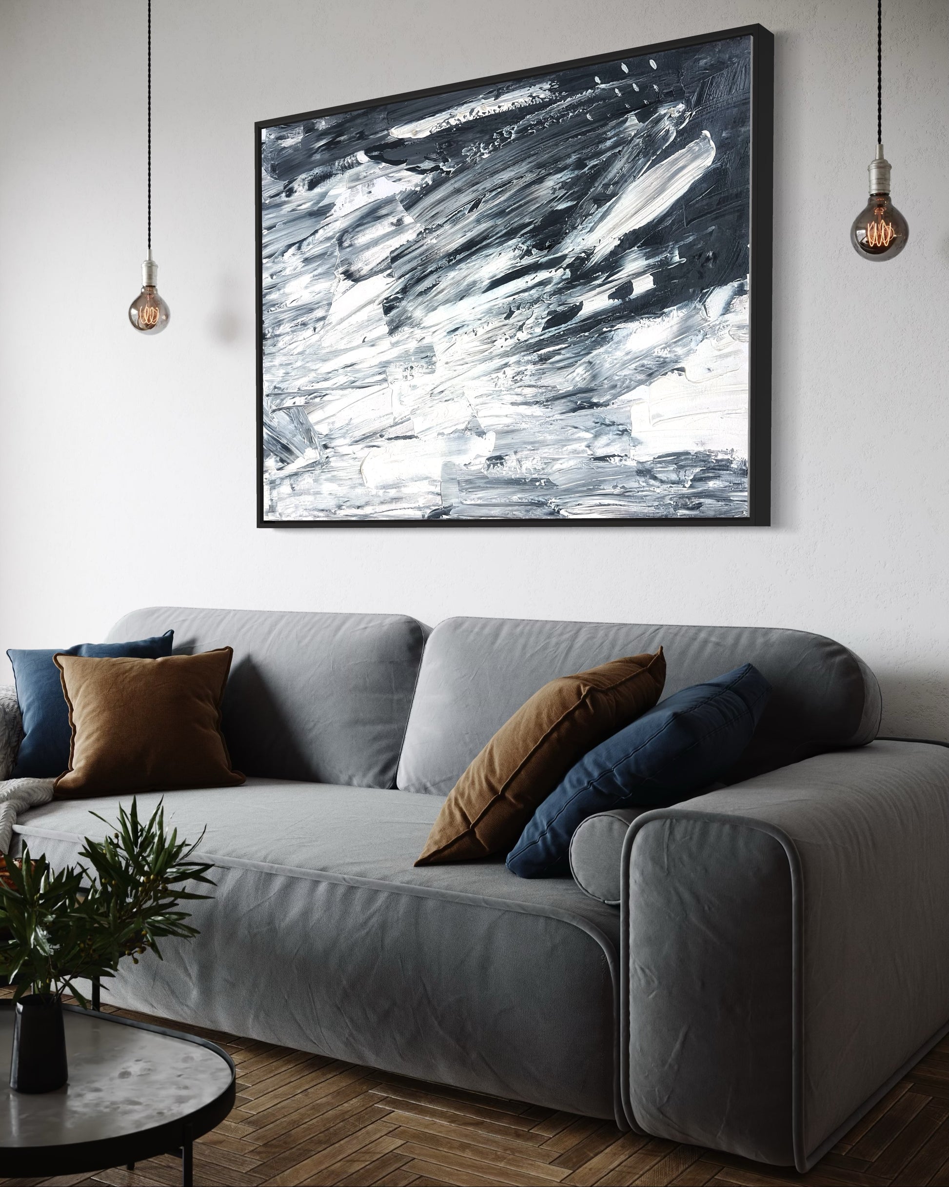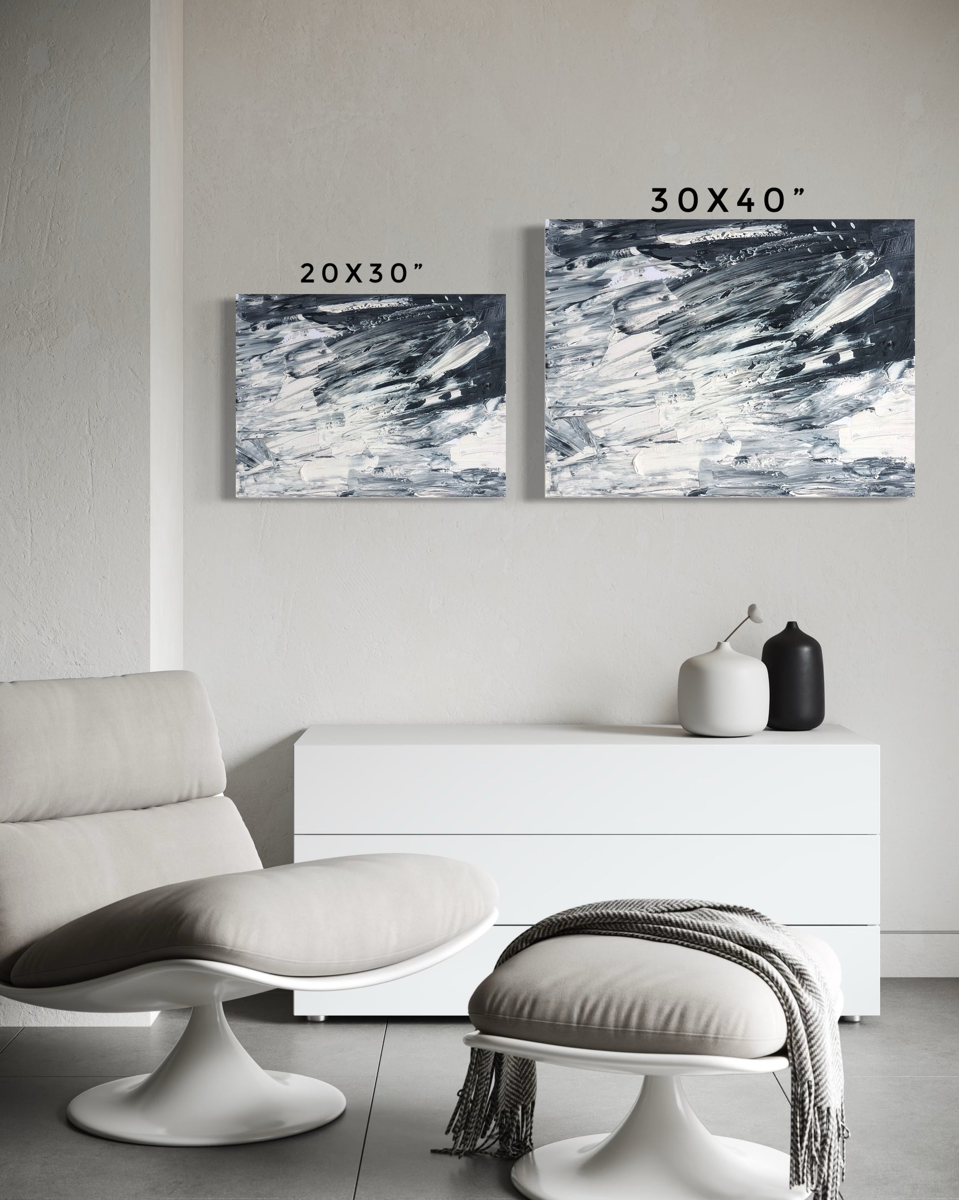 Drift captures the quiet turbulence of thoughts and emotions — a visual meditation on movement, uncertainty and inner stillness. With sweeping strokes of black, white, and silvery grey, this textured abstract work evokes the sensation of drifting clouds, shifting tides or fleeting memories. The monochrome palette allows the bold palette knife textures to take center stage, creating an atmosphere that is both intense and calming.