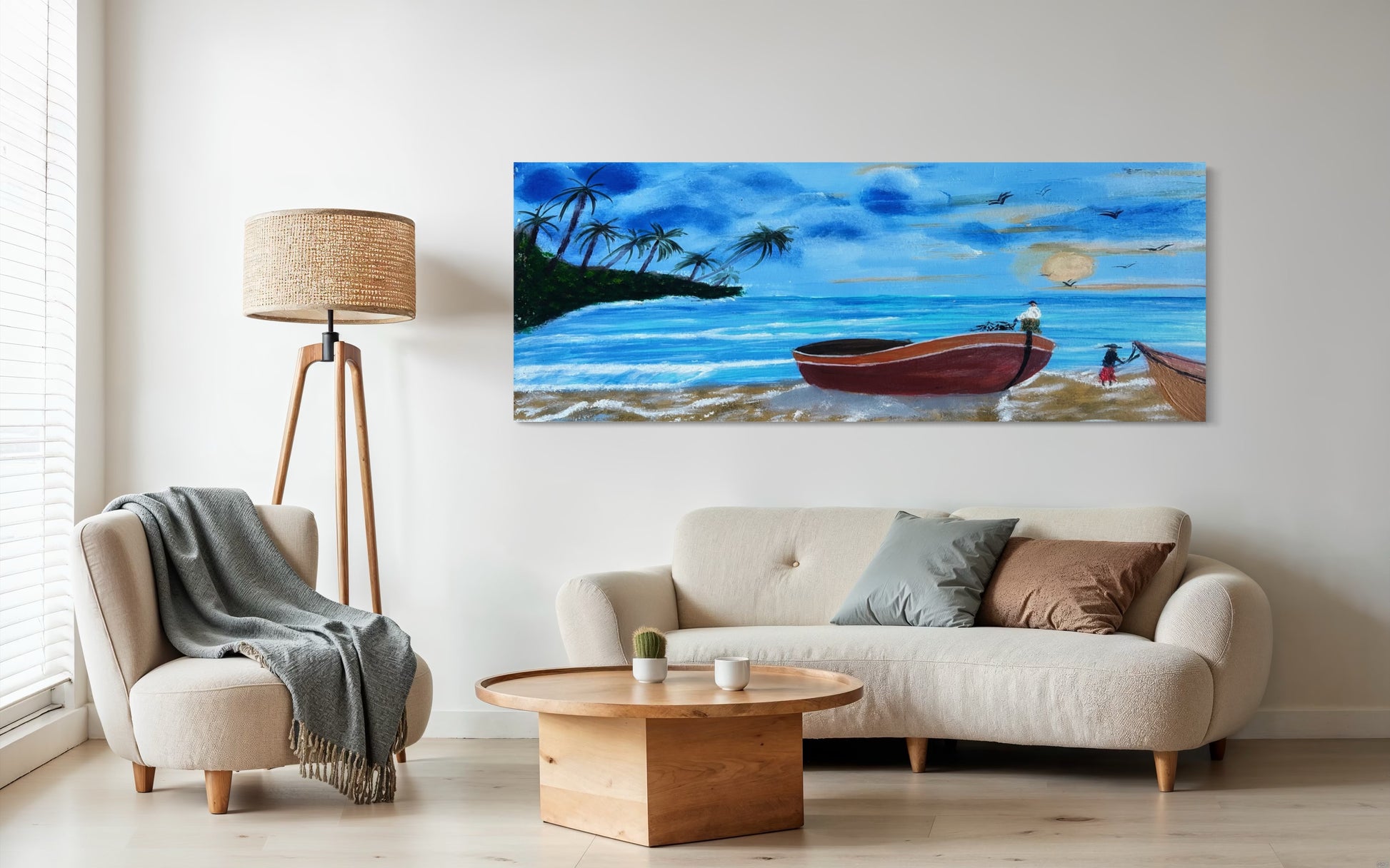 Seaside is a heartfelt portrayal of two fishermen by their boat, quietly tending to their nets under the open sky. This painting captures the rhythm of coastal life — where the ocean isn’t just a view, but a livelihood. With soft strokes and earthy tones, Seaside invites you into a moment of honest labor, shared purpose, and timeless connection between man and sea.